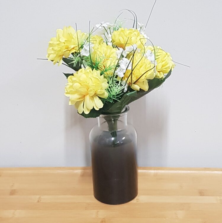 Een zijden boeket met bloemen in de kleurstelling geel en wit. Het boeket heeft 1 steel wat handig is als je het boeket wil gaan steken in oase. Ook leuk als tafeldecoratie!