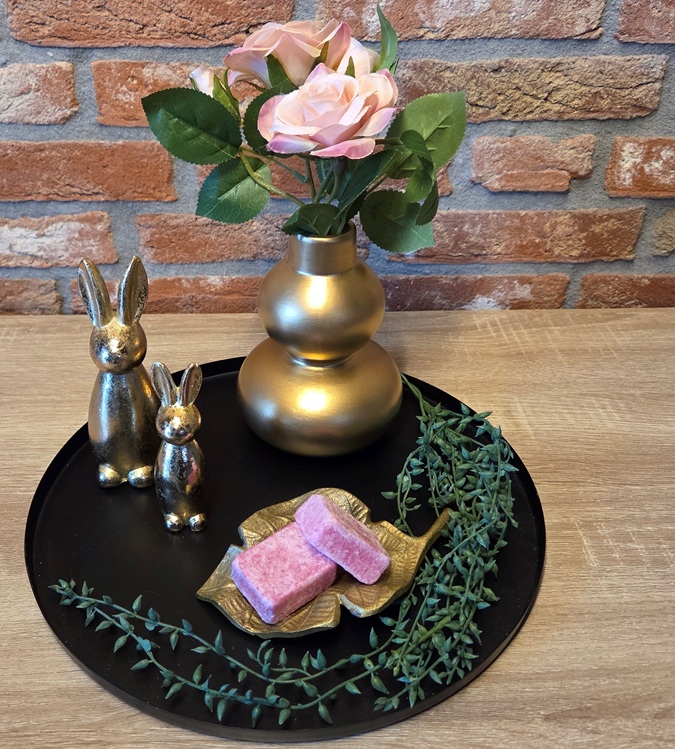 Set bevat een zwart metalen tray, goudkleurig vaasje met roze kunstroosjes, groen takje, twee geurblokjes op een goud schaaltje in de vorm van een blad en twee goudkleurige paashaasjes.